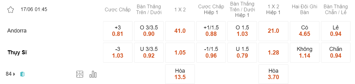 Tỉ lệ kèo Andorra vs Thụy Sĩ