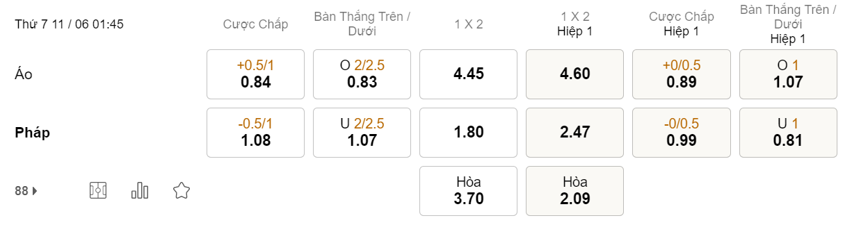 Soi kèo châu Á Áo vs Pháp: 0.84*0.5/1*1.08