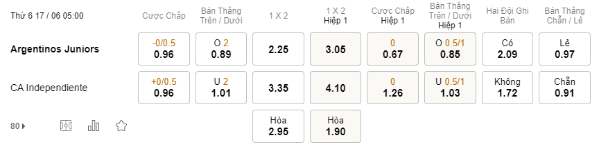 Soi kèo châu Á Argentinos Juniors vs Independiente: 0.96*0/0.5*0.96