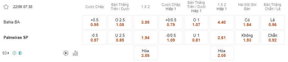 Tỉ lệ kèo Bahia vs Palmeiras