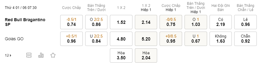 Soi kèo Châu Á Bragantino vs Goias: 0.74*0.5/1*0.96