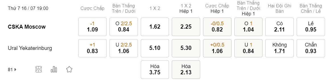 Soi kèo tài xỉu CSKA Moscow vs Ural: 0.84*2/2.5*1.06