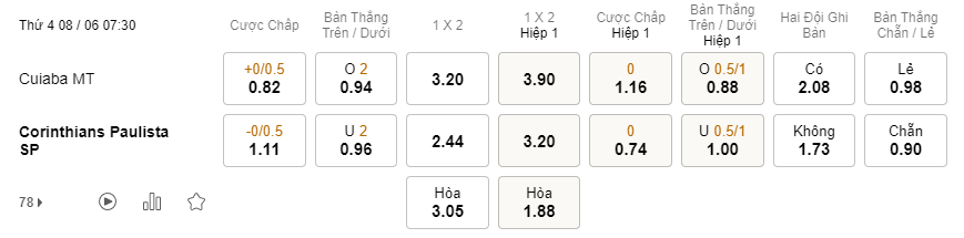Soi kèo châu Á Cuiaba vs Corinthians: 0.82*0/0.5*1.11
