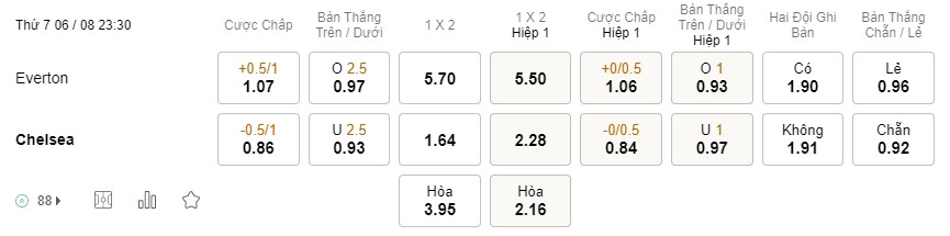 Soi kèo châu Á Everton vs Chelsea: 1.07*0.5/1*0.86