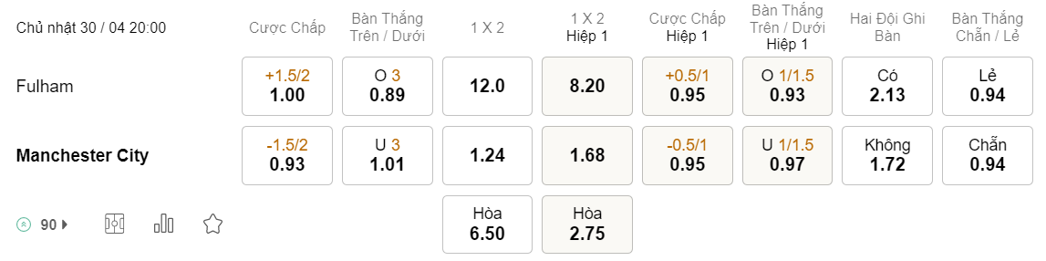 Soi kèo châu Á Fulham vs Man City: 1.00*1.5/2*0.93