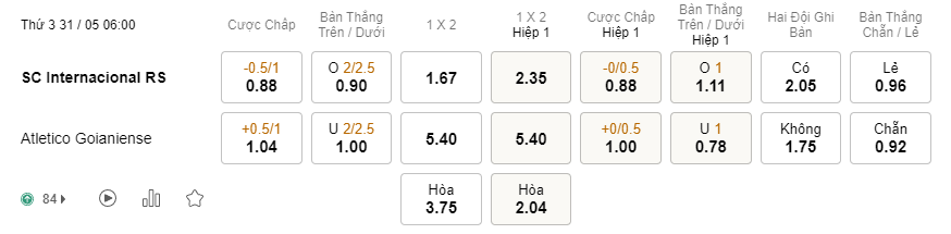 Soi kèo hiệp 1 Internacional vs Atletico GO: 0.88*0/0.5*1.00