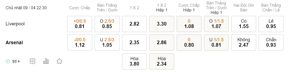 Với thế trận phóng khoáng như vậy, việc bàn thắng đã tới ngay trong hiệp 1 ở 2/3 lần gần nhất Liverpool đối đầu Arsenal cũng không phải điều gì quá bất ngờ. Vì vậy khả năng cao, Arsenal đang có phong độ ấn tượng sẽ mở tỉ số ngay ở 45 phút thi đấu đầu tiên.