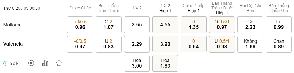 Soi kèo hiệp 1 Mallorca vs Valencia: 1.35*0*0.64