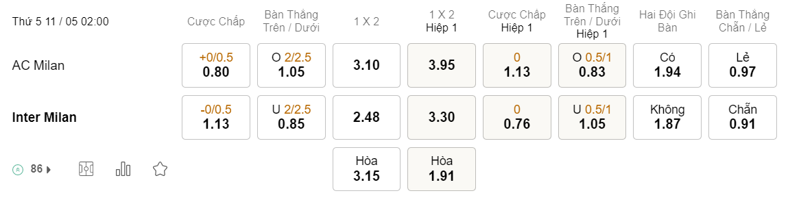 Soi kèo hiệp 1 Milan vs Inter: 1.13*0*0.76