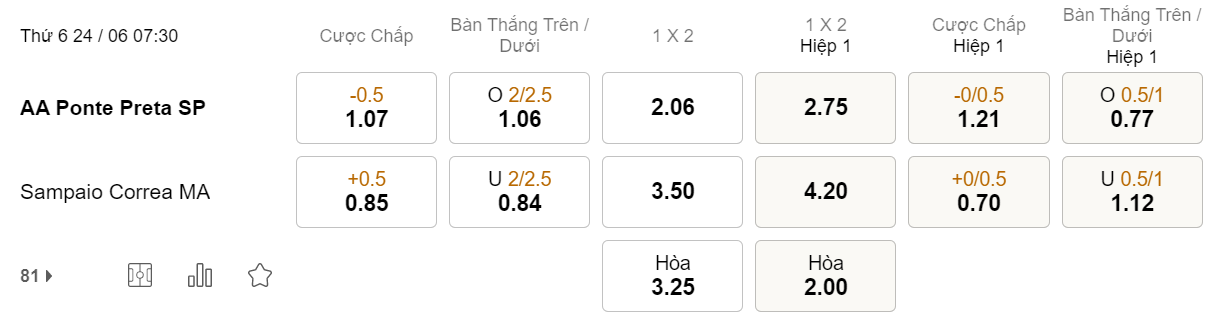Soi kèo hiệp 1 Ponte Preta vs Sampaio Correa: 1.21*0/0.5*0.70