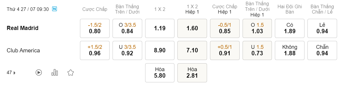 Như đã phân tích, America không ngại chơi cởi mở. Đó cũng là lý do mà đội bóng này đã để thủng lưới ngay trong hiệp 1 ở 2/3 trận đấu gần nhất trước những đối thủ vượt trội hơn. Vì vậy với việc Real Madrid sẽ tự tin dồn lên tấn công thì khả năng cao họ sẽ có điều mình cần ở ngay 45 phút thi đấu đầu tiên.