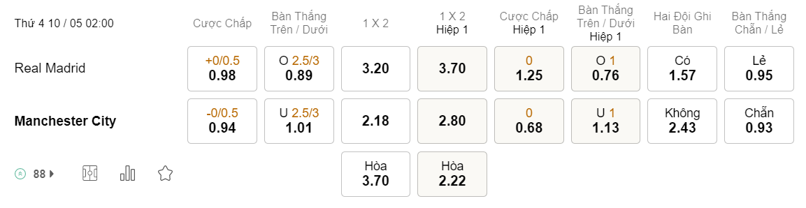 Soi kèo hiệp 1 Real Madrid vs Man City: 1.25*0*0.68