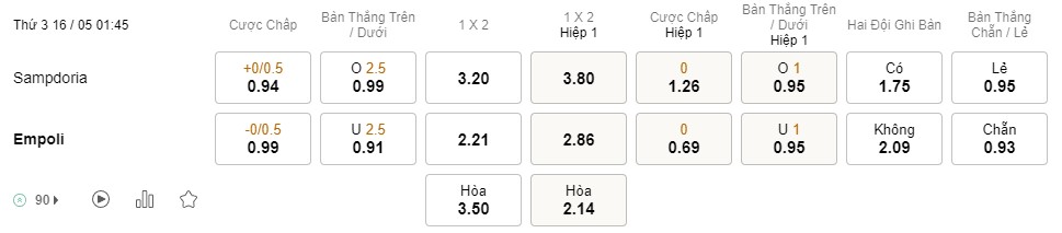 Tỉ lệ kèo Sampdoria vs Empoli