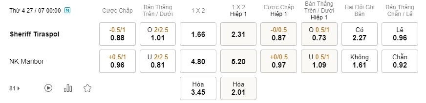 Với Maribor, họ chỉ để thua duy nhất 1 trong 5 trận gần nhất, tuy nhiên xen kẽ đó cũng là 2 chiến thắng và 2 thất bại. Chính vì vậy, các chuyên gia nhận định lựa chọn Sheriff với điểm tựa sân nhà vững chắc sẽ là chính xác hơn.