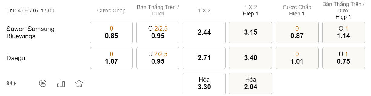 Tỉ lệ kèo Suwon Bluewings vs Daegu