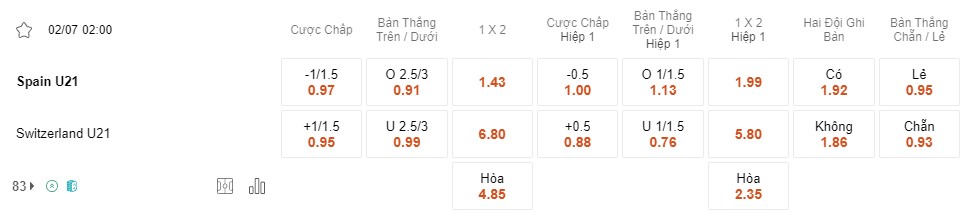 Tỉ lệ kèo U21 Tây Ban Nha vs U21 Thụy Sĩ